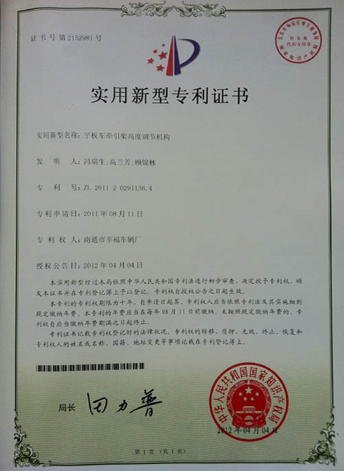 平板車牽引架高度調節(jié)機構專利證書